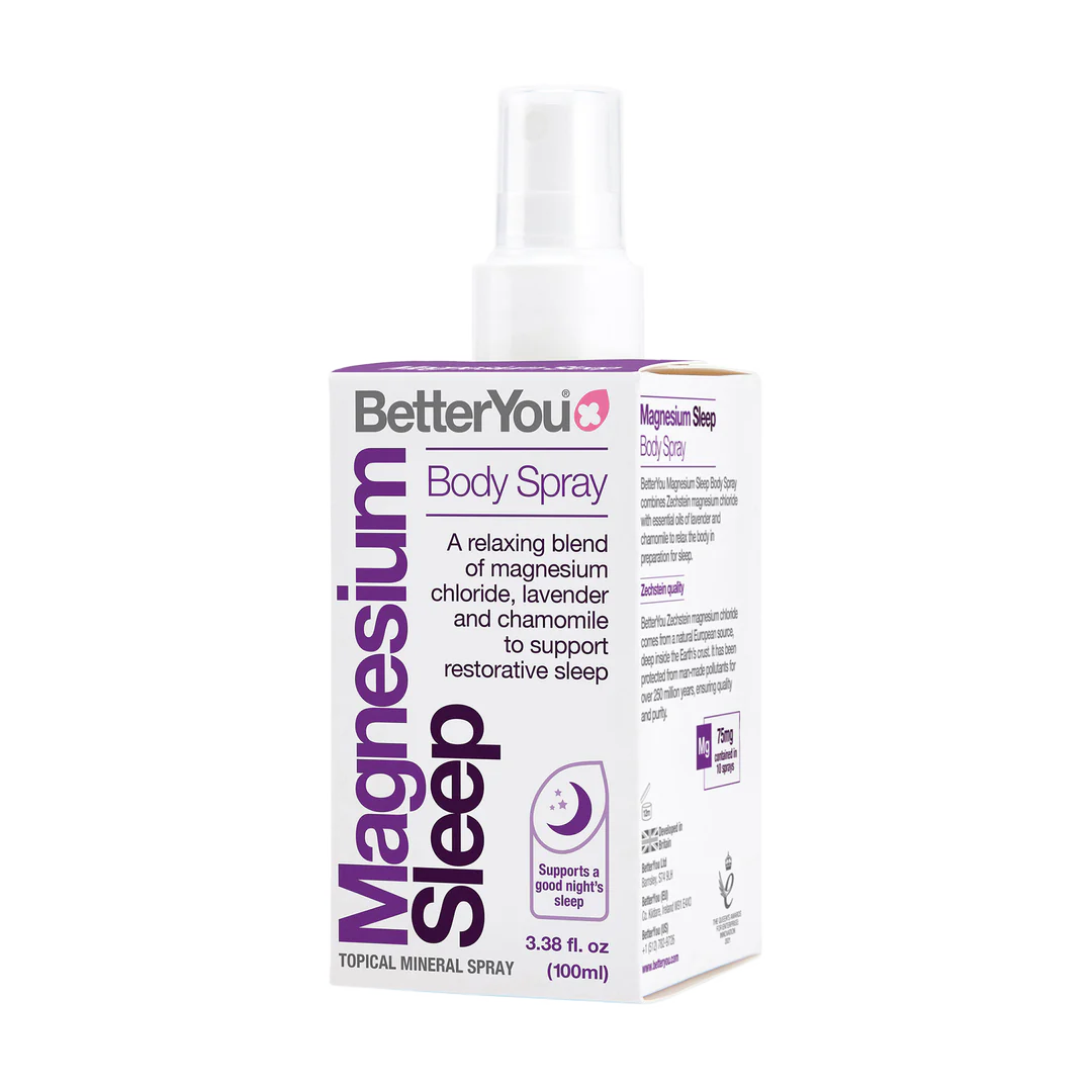 BetterYou Magnesium Sleep Body Spray combines Zechstein magnesium with calming essential oils like lavender and chamomile to enhance relaxation and improve sleep quality. Delivering 75mg of magnesium per 10 sprays, it is ideal for promoting restful nights. Suitable for adults and children aged 13 and above, this spray can also be used during pregnancy with professional guidance.