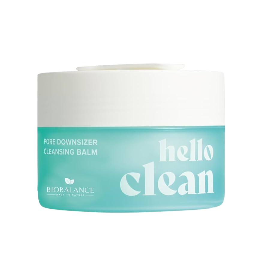 BioBalance Hello Clean Pore Downsizer Cleansing Balm melts into a silky oil that removes makeup and impurities while reducing pores, blackheads, and oily skin for a refreshed, balanced complexion