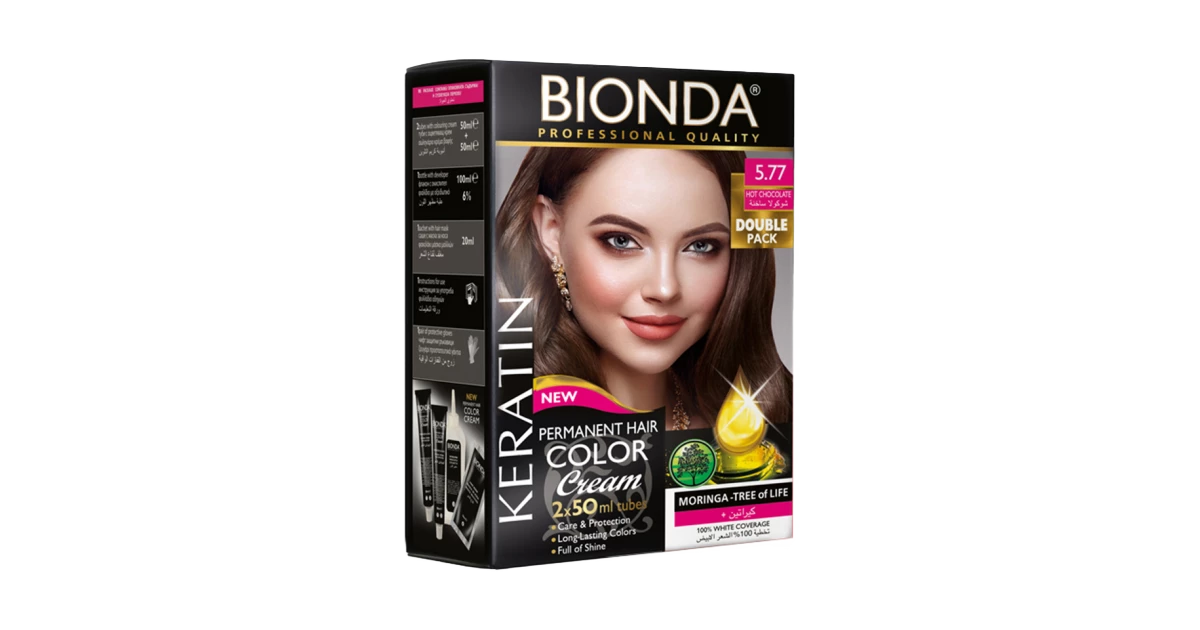 Experience vibrant color and nourishment with Bionda Hot Chocolate 5.77, a permanent hair color cream designed for complete white hair coverage. Infused with natural oils from Moringa, Shea, and Olive, along with Wheat proteins, this formula not only colors but also protects and strengthens your hair. The kit comprises two 50ml bottles of hair dye cream, a 6% oxidizer, a hair mask for post-color treatment, safety gloves, and an instruction manual for easy application. Enjoy a long-lasting, rich chestnut hue that enhances your natural beauty while keeping your hair healthy. Ideal for those seeking a professional-quality color experience at home.