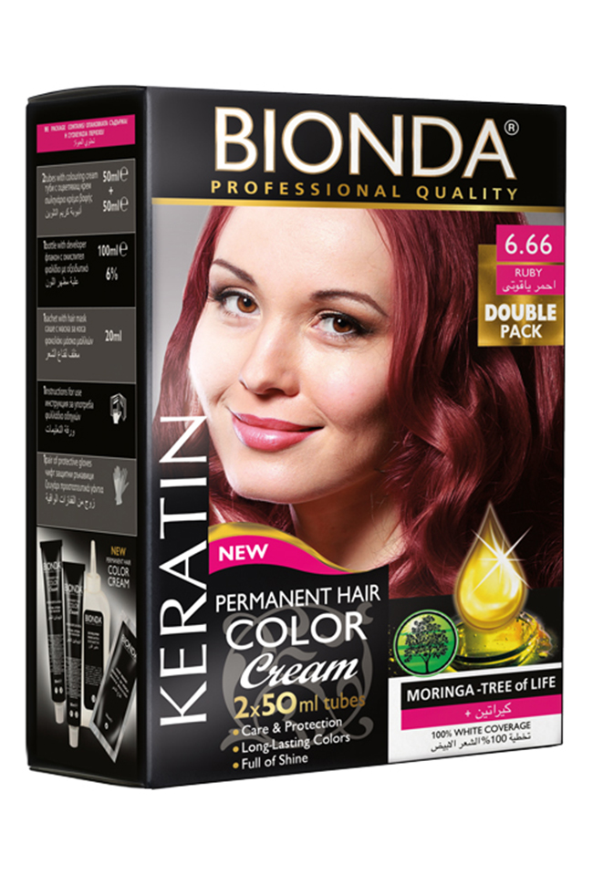 Bionda Permanent Hair Color Professional Double № 6.66 Ruby offers intense, long-lasting color with 100% white hair coverage. Infused with natural oils and wheat proteins, it leaves hair soft, smooth, and shiny. The package includes everything needed for application and post-color treatment.