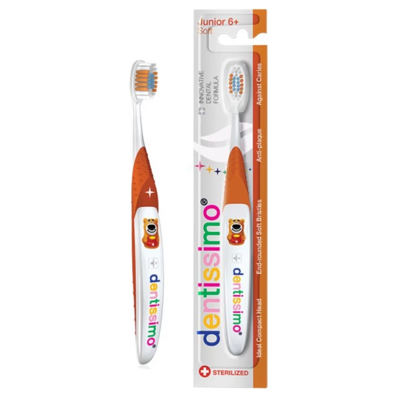The Dentissimo Junior 6+ Soft Toothbrush is expertly designed for children aged 6 and above, featuring a compact head and soft, round-ended bristles that effectively clean while safeguarding enamel and gums. Its ergonomic, non-slip handle ensures a comfortable grip for better control during brushing. The toothbrush also includes a hygienic cap for added cleanliness.