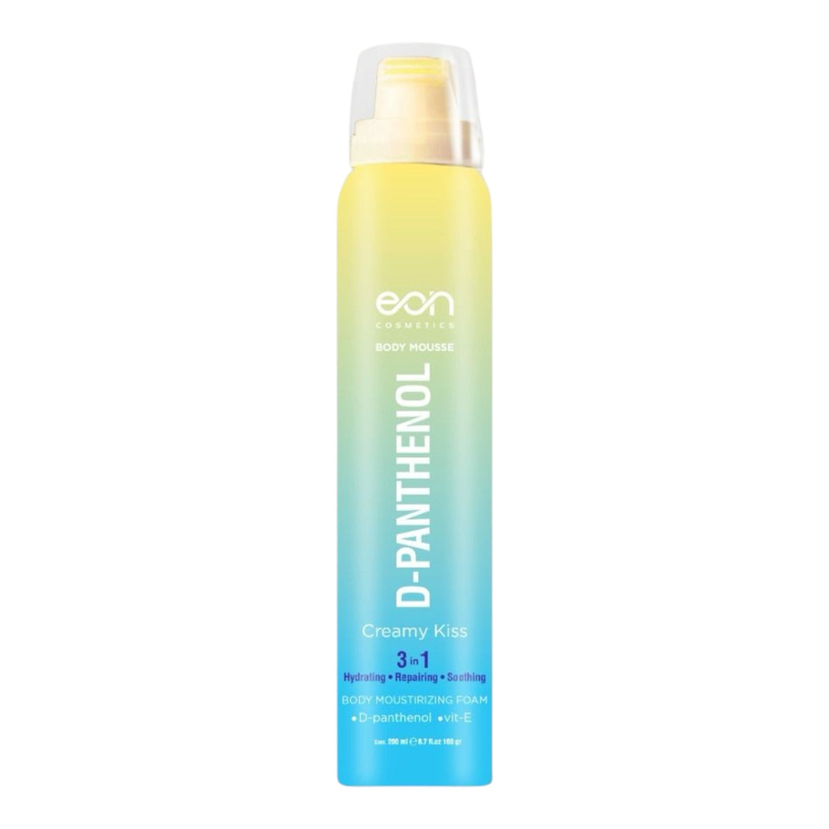 Eon Body Mousse D-Panthenol Creamy Kiss is designed to offer deep hydration and skin repair with its unique lightweight foam texture. Infused with 1% D-Panthenol (Provitamin B5), this mousse not only moisturizes but also improves skin elasticity and supports natural repair processes. The addition of Vitamin E acts as a powerful antioxidant, protecting the skin from free radicals while enhancing softness and smoothness. Its fast-absorbing formula ensures that it can be used daily without any sticky feeling, making it perfect for full-body application, including the face (avoiding the eye area). A small amount provides wide coverage, reinforcing the skin's natural barrier to combat dryness and irritation. This product is suitable for all skin types, ensuring everyone can enjoy its soothing benefits.