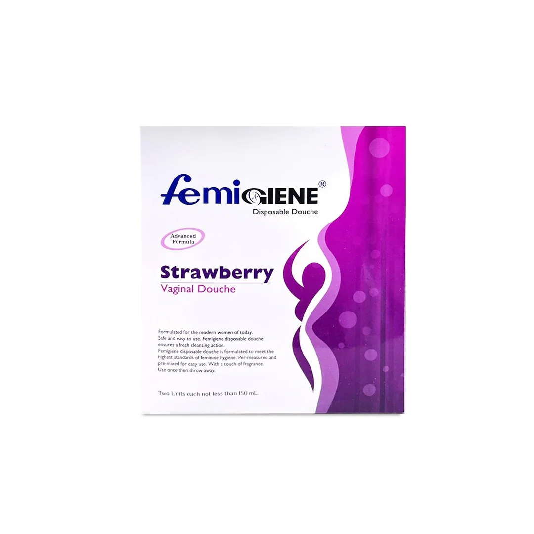 The Femigiene Strawberry Vaginal Douche is a disposable wash designed for feminine hygiene and freshness. It features Benzalkonium Chloride to eliminate harmful bacteria and is pH-balanced for comfort. With a refreshing strawberry scent, it is ideal for post-menstrual care, pre- and post-intercourse cleansing, and after medical examinations.