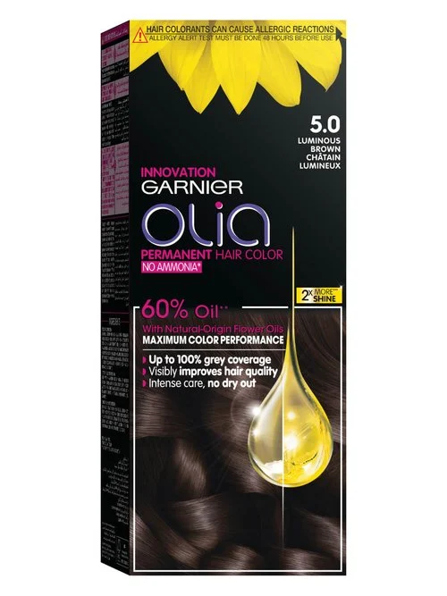 Garnier Olia Hair Color 5.0 Brown is designed to provide a deep, lasting brown hue that complements various skin tones. This permanent hair dye features an innovative ammonia-free formula, making it a gentler choice for your hair. With 60% oil content derived from natural sources, it not only colors but also nourishes your hair, leaving it soft and radiant. The easy-to-use application allows for even coverage, ensuring that every strand is beautifully colored. Ideal for those looking to enhance their hair's natural beauty while maintaining its health, this product is a perfect addition to your hair care routine.
