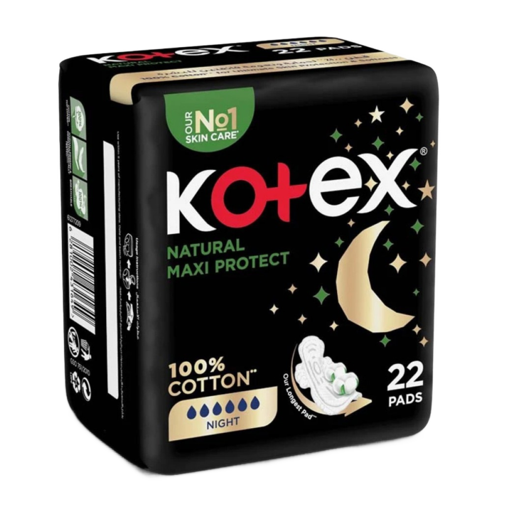 Kotex Natural Maxi Protect Night Pads (22 pieces) provide overnight protection with natural softness, extra coverage, and high absorbency.