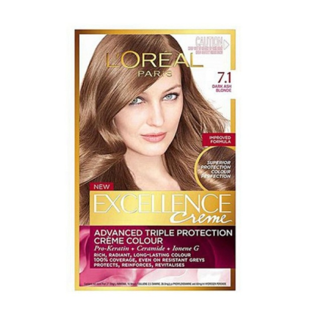L'Oréal Excellence Crème 7.1 Ash Blonde offers a permanent hair color solution that delivers rich, radiant, and long-lasting results. It provides 100% gray coverage, ensuring a vibrant and consistent ash blonde shade. The formula is enriched with Pro-Keratin, which helps to strengthen hair, making it more resilient and healthy-looking. This hair dye is ideal for those seeking a natural yet striking color change, with the added benefit of nourishment from its advanced formulation. The inclusion of nourishing oils like olive, avocado, and shea butter in similar products ensures that the hair remains soft and shiny post-application. L'Oréal's micro-oil technology enhances color depth and shine, providing a salon-quality finish at home. This product is perfect for individuals looking to maintain a youthful appearance with a sophisticated, ash blonde hue.