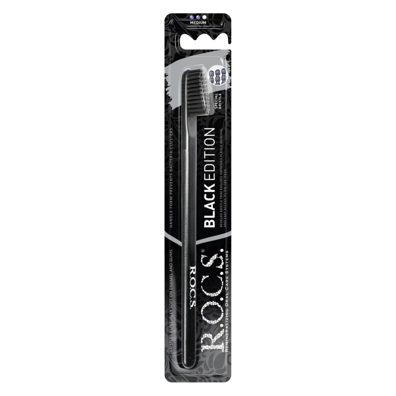 The R.O.C.S. Black Edition Adult Toothbrush is engineered for superior oral hygiene with its high-quality fiber bristles that are texturized for enhanced cleaning efficiency. The innovative triple-polishing technology used on the bristle tips minimizes wear on enamel while maximizing plaque removal. Its non-traditional beveled cut allows for better access to hard-to-reach areas, ensuring a thorough clean. The toothbrush is designed with a slim, lightweight handle made from safe, high-quality plastic, providing a comfortable and secure grip during use. Ideal for daily brushing, this toothbrush not only promotes dental health but also adds a touch of elegance to your oral care routine.