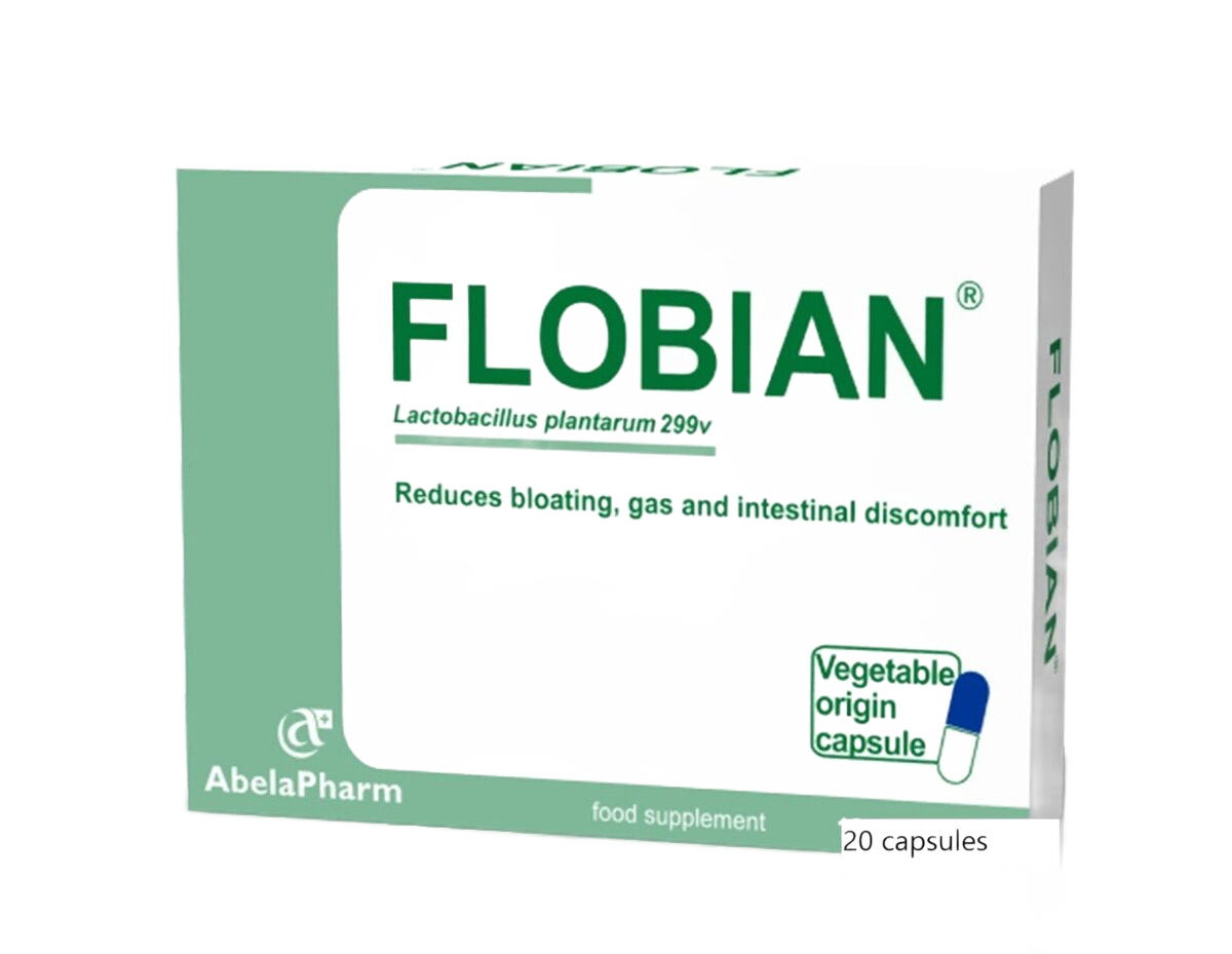 Flobian is a dietary supplement formulated to help alleviate symptoms of irritable bowel syndrome (IBS), including bloating, gas, and abdominal pain. Featuring the probiotic strain *Lactobacillus plantarum* 299v, it promotes gut health and regular bowel movements. Available in various capsule counts, Flobian is ideal for both short-term and ongoing symptom management.