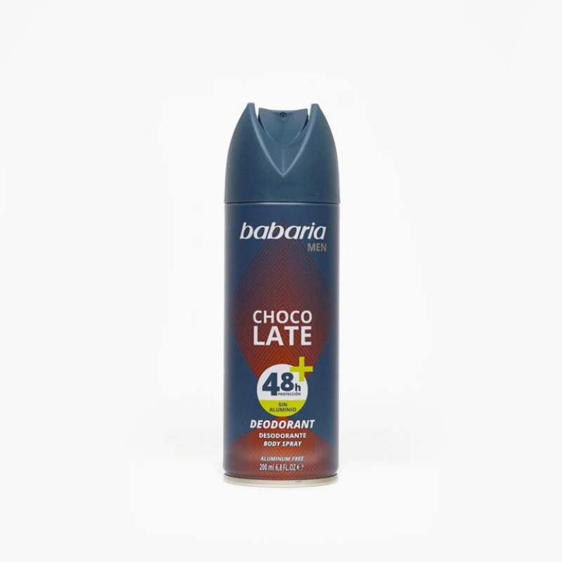 Babaria Body Spray Deodorant Chocolate for Men combines a rich chocolate fragrance with long-lasting freshness and moisturizing care, free from aluminum and enriched with soothing aloe vera.