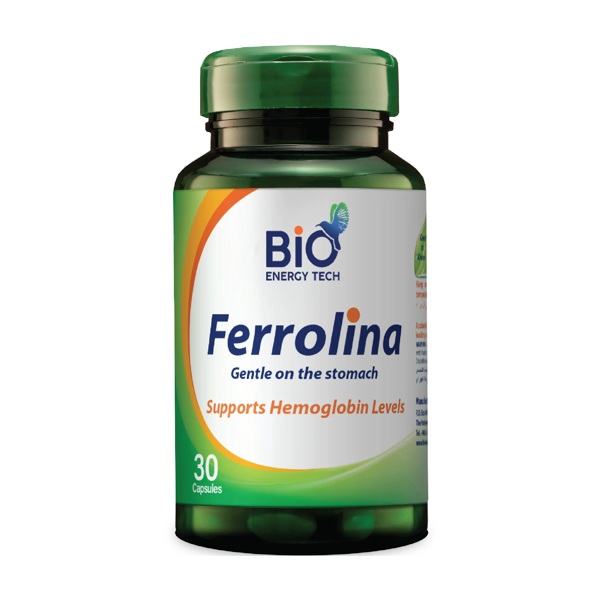Bio Ferrolina is a premium iron supplement designed to enhance hemoglobin levels and support overall blood health. Each capsule contains 27 mg of Ferrous Bisglycinate and 340 mg of Spirulina, making it ideal for promoting heart health and beneficial during pregnancy. This supplement is crafted by BioEnergyTech for optimal absorption and effectiveness.
