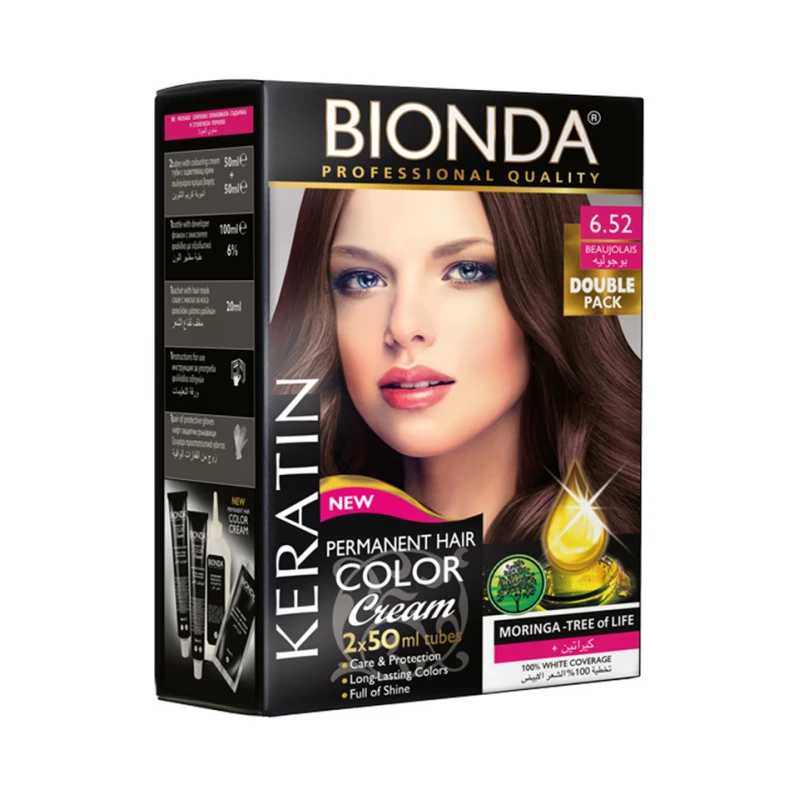 The Bionda Professional Double Permanent Hair Cream 6.52 Beaujolais comes in a convenient package featuring two 50ml bottles of hair dye cream, along with a 6% oxidizer, a nourishing hair mask, safety gloves, and an instruction manual. This hair color cream is specifically formulated to provide complete coverage of white hair, resulting in a vibrant and long-lasting chestnut hue. Infused with natural oils from Moringa, Shea, Olive, and Wheat proteins, it not only colors but also conditions your hair, leaving it soft, smooth, and shiny. The included hair mask enhances post-color treatment, ensuring your hair remains healthy and vibrant. With easy-to-follow instructions, this product is suitable for at-home use while maintaining professional quality results.