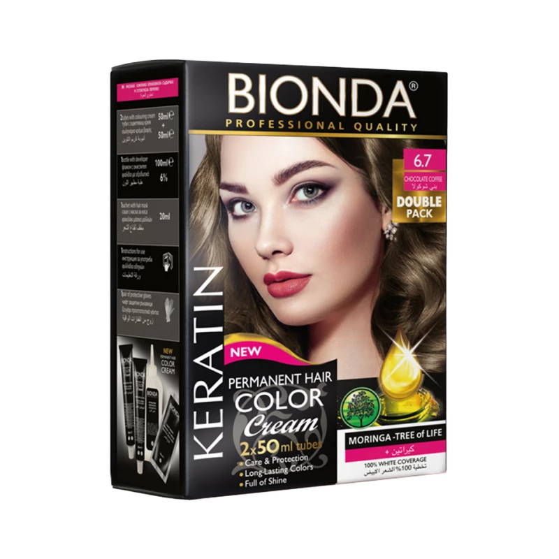 Bionda Permanent Hair Color Professional Double № 6.7 Chocolate Coffee is designed for those seeking a vibrant and enduring hair color. This product includes two 50ml bottles of hair dye cream, a 6% oxidizer, a post-color treatment hair mask, safety gloves, and an instruction manual for easy application. Its formulation ensures complete white hair coverage while delivering a deep chestnut shade that enhances your natural beauty. Infused with nourishing ingredients such as Moringa, Shea, Olive oils, and Wheat proteins, this hair color cream not only colors but also conditions your hair, leaving it soft, smooth, and shiny. Ideal for professional use or at-home application, this product provides a salon-quality finish with every use.