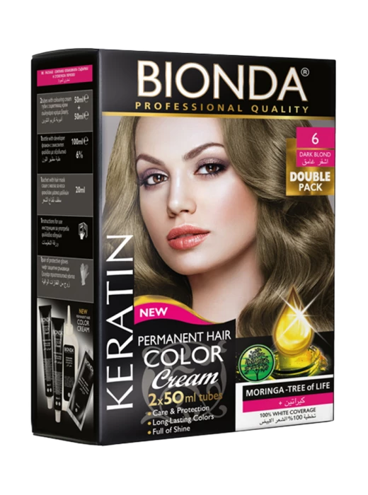 Experience the transformative power of Bionda Permanent Hair Color Professional Double № 6 Dark Blond, designed for those seeking a rich, dark blonde hue. This professional-grade hair dye comes with two 50ml bottles of dye cream and a 6% oxidizer, ensuring a perfect blend for optimal results. The formula is infused with nourishing natural oils from Moringa, Shea, and Olive, along with Wheat proteins, which work together to protect and condition your hair while coloring. Enjoy complete coverage of white hair and a vibrant color that lasts. After coloring, the included hair mask provides an extra layer of care, leaving your hair soft, smooth, and radiant. With easy-to-follow instructions and safety gloves included, achieving salon-quality results at home has never been easier.