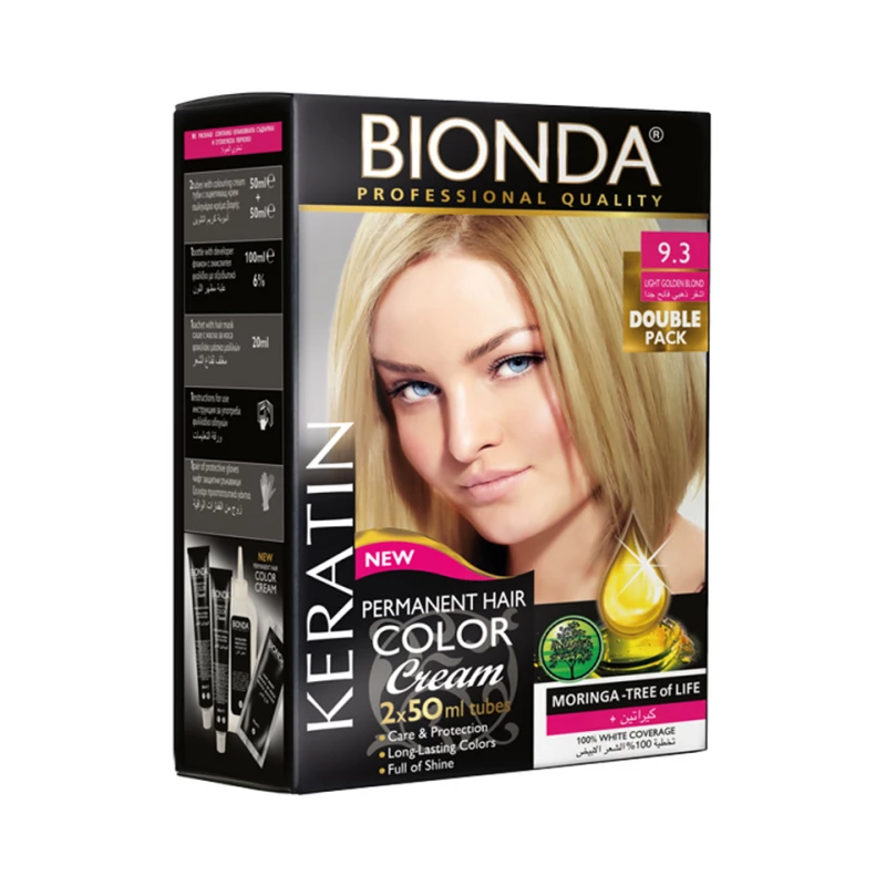 Bionda Permanent Hair Color Professional Double № 9.3 Light Golden Blond offers vibrant, long-lasting color with 100% white hair coverage. The kit includes everything needed for application, including a nourishing hair mask and protective gloves. Enriched with natural oils and proteins, it leaves hair soft, smooth, and shiny.