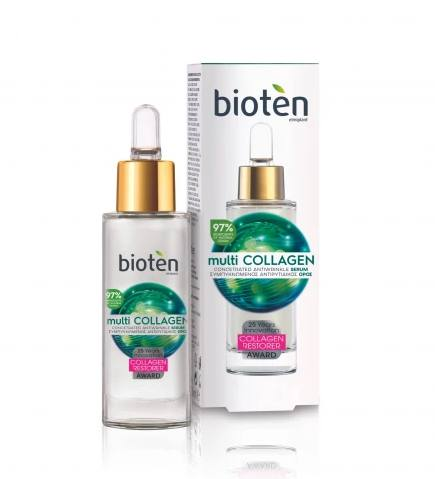 Bioten Multi-Collagen Antiwrinkle Concentrated Serum is formulated to reduce wrinkles and enhance skin firmness. Infused with an award-winning Collagen Restorer, it stimulates three types of collagen and includes hyaluronic acid for hydration. With 97% natural ingredients and nourishing sweet almond oil, this serum promotes healthier, more youthful-looking skin.