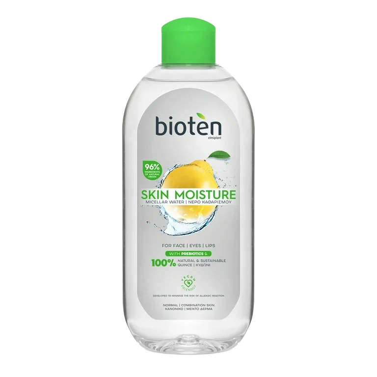 BIOTEN Micellar Water Moisture Normal 400ml is expertly crafted for normal and combination skin types, utilizing 100% natural Quince extract and prebiotics to maintain skin's natural balance. This micellar water effectively removes makeup, including waterproof varieties, and eliminates impurities from the face, eyes, and lips without causing irritation or dehydration. The micellar technology features ultra-fine particles that 'trap' and remove impurities, ensuring a clean and refreshed complexion. With 96% ingredients of natural origin, it supports healthy skin flora while the Hydro Nutrient Complex prevents dehydration, maintaining skin smoothness and comfort. Its gentle formula ensures thorough cleansing without inducing dryness, making it suitable for daily use. Simply apply with a cotton pad, no rinsing required, to enjoy a refreshed and hydrated skin experience.