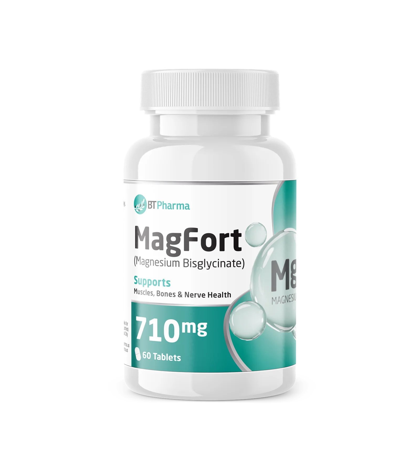 BT Pharma MagFort 710mg is a dietary supplement featuring magnesium bisglycinate, known for its high absorption rate. This product supports muscle and nerve function, promotes relaxation, and aids in achieving restful sleep. Additionally, it contributes to overall bone and cardiovascular health.