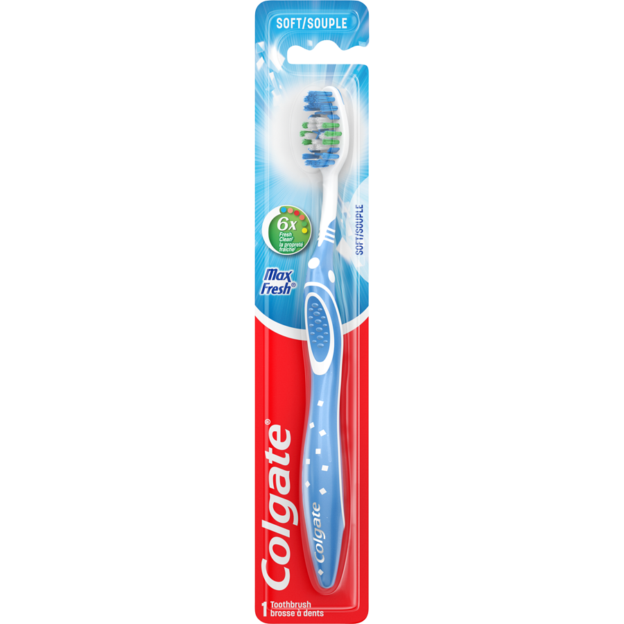 The Colgate Max Fresh Soft Toothbrush is designed to provide a comprehensive oral care experience. It features soft, angled, multi-height bristles that effectively clean deep between teeth and along the gum line, promoting healthier gums. The toothbrush also includes a built-in tongue cleaner that helps remove odor-causing bacteria, contributing to fresher breath. Its ergonomic design ensures comfortable handling, making it easy to reach all areas of the mouth. Ideal for those with sensitive gums, this toothbrush offers gentle yet effective cleaning. The inclusion of a tongue cleaner enhances its functionality, making it a versatile tool for maintaining oral hygiene. With its thoughtful design, this toothbrush supports a thorough and refreshing cleaning routine.