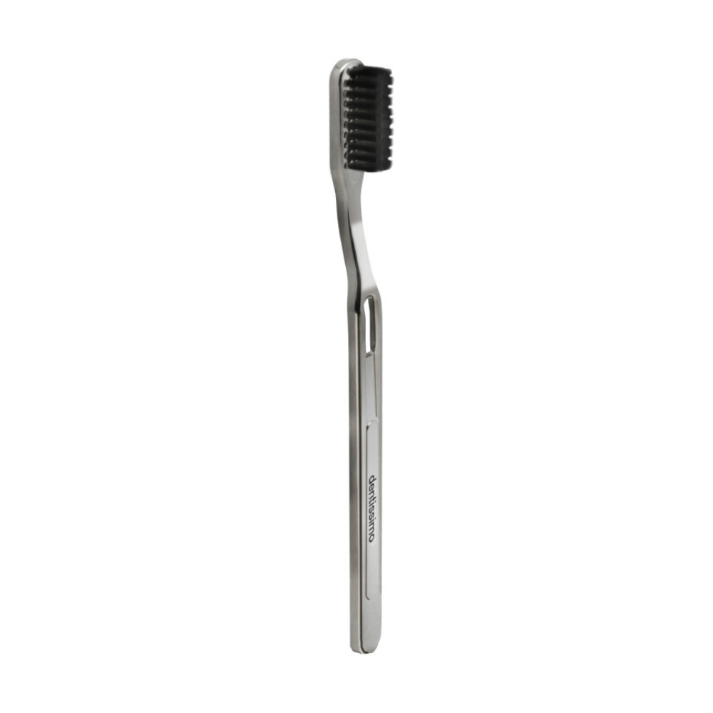 The Dentissimo Chromed Silver Toothbrush features a sleek chromed silver handle and hard Tynex bristles for effective plaque and tartar removal. Its design ensures gentle cleaning without harming tooth enamel or gums. The included plastic case doubles as a travel case, making it a practical choice for on-the-go oral care.