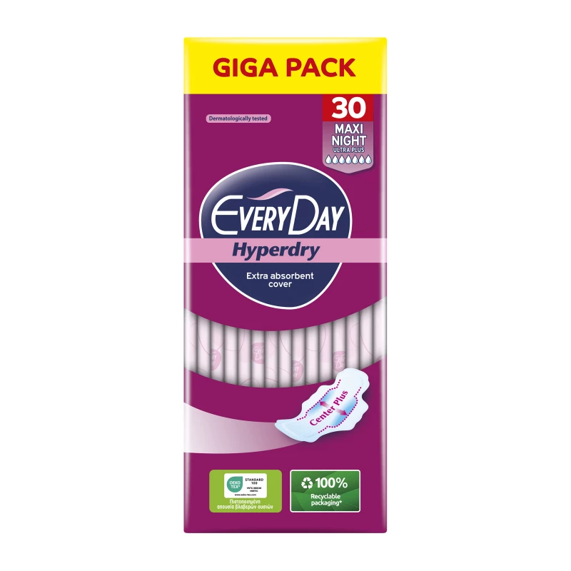 Everyday Hydry GIGA Pack Maxi 30pcs offers superior absorbency, comfort, and freshness with soft, breathable materials for all-day protection.
