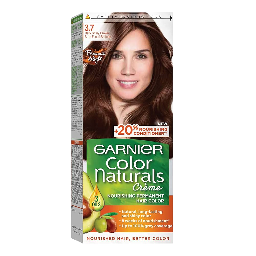 Garnier Color Naturals 4.7 - Dark Shiny Brown is a permanent hair colorant that offers up to 100% grey coverage. Enriched with nourishing ingredients like avocado oil, olive oil, and shea butter, it ensures your hair remains healthy and vibrant even after coloring. Experience a natural, long-lasting color that enhances shine and hydration.
