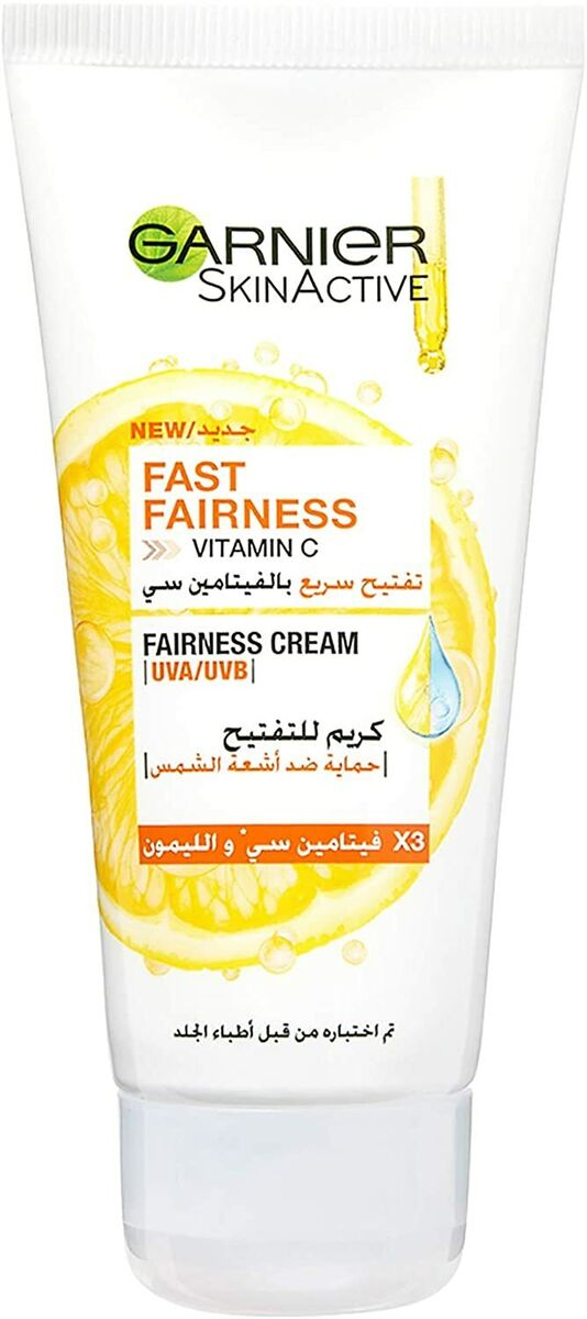 Garnier Fast Fairness Day Cream is enriched with 3X Vitamin C and Lemon to visibly fade spots and brighten skin. It offers UVA/UVB protection, ensuring your skin is shielded from harmful sun rays. Experience brighter, spotless skin in just one week.
