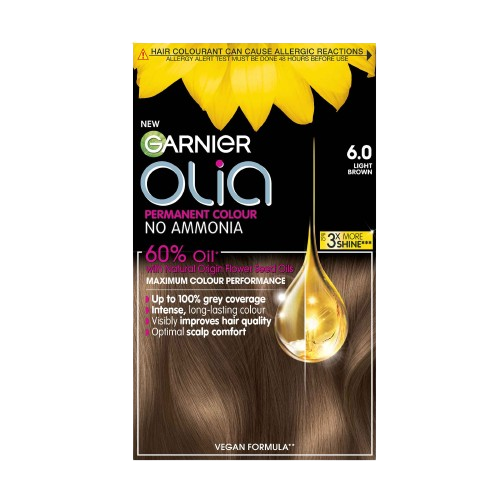 Garnier Olia 6.0 Light Brown is an ammonia-free hair dye with 60% natural oils that nourishes, hydrates, and delivers full gray coverage with a shiny, even color.