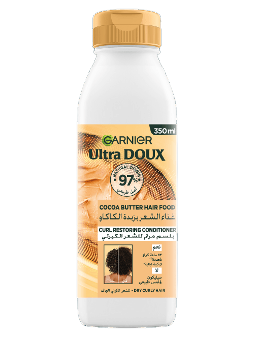 Garnier Ultra Doux Hair Food Cocoa Butter Curls Conditioner is specially formulated to nourish and restore dry, curly hair. Enriched with cocoa butter and jojoba oil, it features an ultra-melting texture for easy detangling and rinsing. Your curls will look healthy, intensely nourished, and beautifully restored.