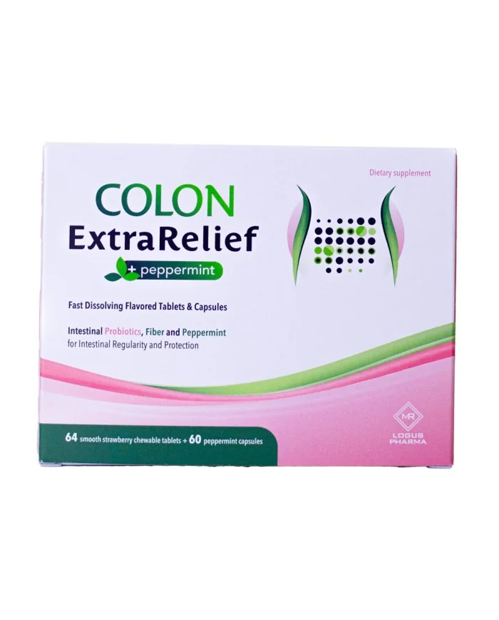 COLON ExtraRelief combines 64 strawberry-flavored chewable tablets with 60 peppermint oil capsules to support digestive health. This product is designed to enhance bowel regularity and manage symptoms associated with Irritable Bowel Syndrome (IBS). The chewable tablets feature a blend of probiotics and prebiotic fibers for optimal digestive function.
