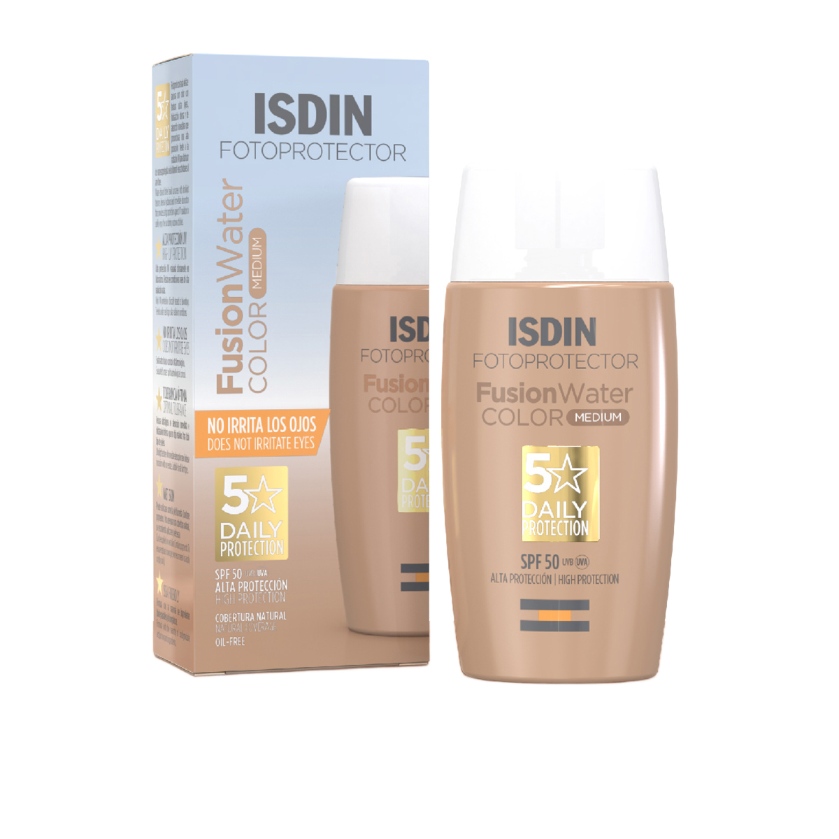 ISDIN Fotoprotector Fusion Water Color SPF50+ 50ML Medium is a tinted, water-based sunscreen designed to provide high sun protection for all skin types, including sensitive and atopic-prone skin. It offers SPF50+ coverage while delivering natural-looking coverage that enhances the skin's appearance. The formula is oil-free and non-comedogenic, ensuring it won't clog pores, making it suitable for daily use. Enriched with hyaluronic acid, it hydrates the skin while protecting it from harmful UV rays. Dermatologically tested and water-resistant, it ensures long-lasting protection even during water activities. The inclusion of Safe-Eye Technology prevents irritation, making it safe for use around the eyes. This sunscreen is ideal for those seeking effective sun protection with added skincare benefits.