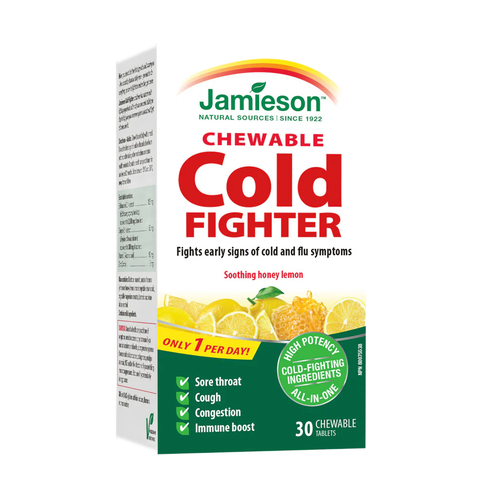 Jamieson Cold Fighter Chewable Tablets – with ginger, echinacea, zinc, and vitamin C to fight colds fast and boost immunity. Tasty, convenient, and fast-acting.