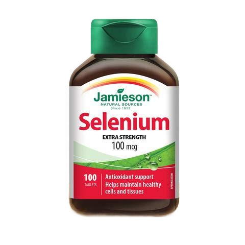 Jamieson Selenium 100 mcg tablets provide essential antioxidant support for overall health. Each tablet contains 100 mcg of selenium, a vital mineral that helps maintain a healthy immune system and supports thyroid function. With 100 tablets per bottle, this supplement is designed for daily use to promote well-being.