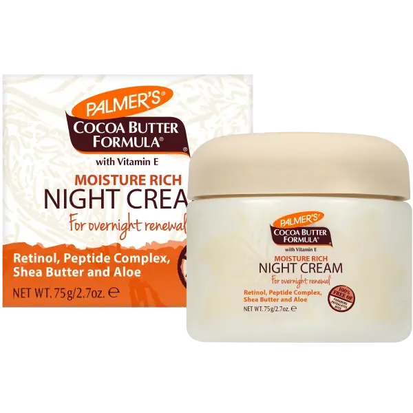 Palmer's Moisture Rich Night Cream is expertly crafted to provide intense hydration and nourishment overnight. Infused with natural cocoa butter, this cream deeply moisturizes the skin, while retinol works to enhance skin texture and promote regeneration. Vitamin E adds an antioxidant boost, helping to protect the skin from environmental stressors. The non-comedogenic formula ensures that it won't clog pores, making it suitable for all skin types, including sensitive skin. Regular use of this night cream can lead to visibly healthier, more radiant skin by morning. Experience the benefits of a restorative skincare routine with this dermatologist-tested cream that prioritizes your skin's health and beauty.