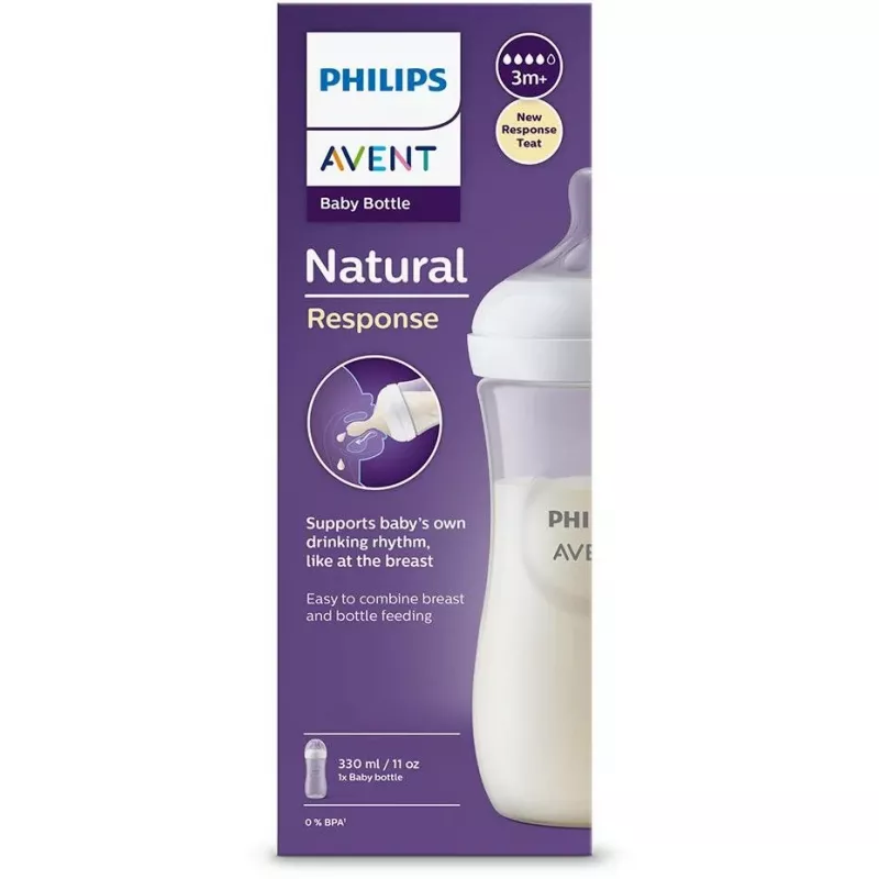 wide breast-shaped teat, natural latch-on, anti-colic valve, 330ml capacity, 3 months+, breastfeeding-friendly