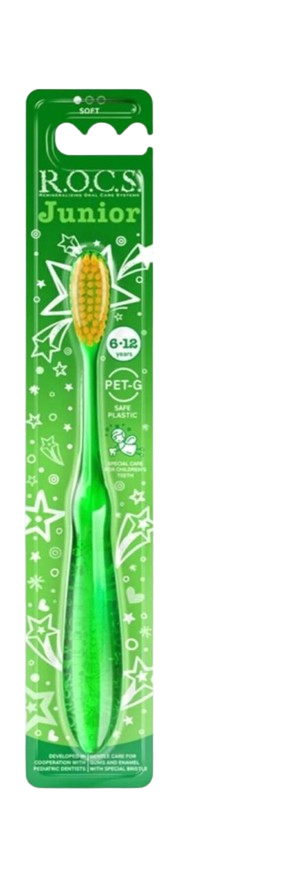 R.O.C.S. Junior 6–12Y Soft Toothbrush Specially designed for children aged 6 to 12, featuring soft bristles that gently clean teeth and protect sensitive gums. Its compact head reaches difficult areas easily, while the ergonomic handle offers better grip and control, encouraging kids to maintain a healthy oral care routine.