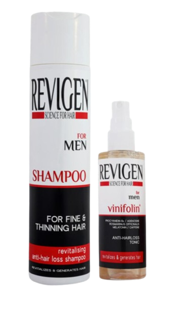 Revigen Anti-Hair Loss Shampoo and Follicure Hair Tonic Spray Men Package strengthens hair roots, reduces hair loss, and promotes healthy hair growth.