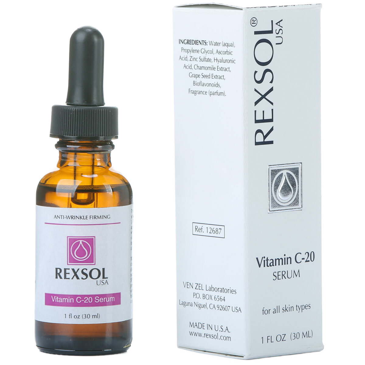 Rexsol Vitamin C-20 Serum is a potent skincare solution featuring 20% stabilized L-Ascorbic Acid to combat signs of aging. This serum helps reduce fine lines, wrinkles, and age spots while enhancing skin tone and elasticity. Suitable for all skin types, it promotes a youthful and radiant complexion.