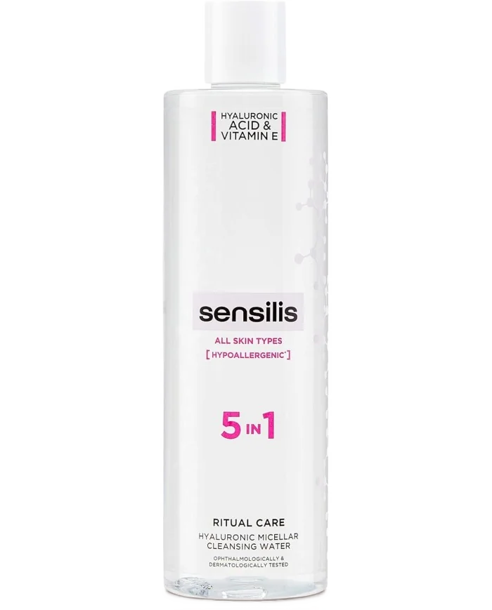 Sensilis Ritual Care Hyaluronic Micellar Cleansing Water is a versatile skincare product designed for all skin types, including sensitive and reactive skin. This micellar water performs five essential actions in one step: it effectively cleanses the skin, removes makeup, tones, hydrates, and soothes, making it a comprehensive solution for daily skincare routines. Its hypoallergenic and fragrance-free formulation ensures gentle care, minimizing the risk of irritation. The inclusion of hyaluronic acid helps maintain skin hydration, leaving it feeling refreshed and balanced. Ideal for those seeking a simplified yet effective skincare regimen, this micellar water offers convenience without compromising on care.