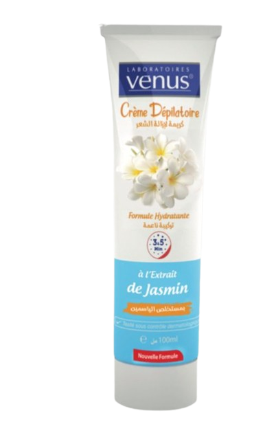 Venus Hair Removal Cream with Jasmine Extract (100ml) gently removes unwanted hair while leaving your skin soft and subtly scented. Suitable for use on legs, underarms, and face, it effectively moisturizes and hydrates the skin. Experience quick results in just a few minutes for a smooth, hair-free finish.