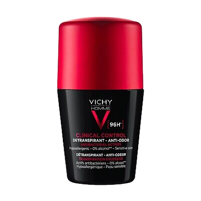 VICHY Deo. Roll-On Clinical Control for men is a dermatologically tested deodorant designed to provide up to 96 hours of sweat and odor protection. Its formula is enriched with powerful anti-perspirant active ingredients, including anti-bacterial Zinc, which helps to combat odor-causing bacteria effectively. The deodorant is alcohol-free, making it gentle and suitable for those with sensitive skin. This roll-on deodorant ensures long-lasting freshness and confidence, even in the most demanding situations. Its clinical control formulation is ideal for individuals seeking reliable and extended protection against perspiration. The product's commitment to skin sensitivity and efficacy makes it a valuable addition to any personal care routine.