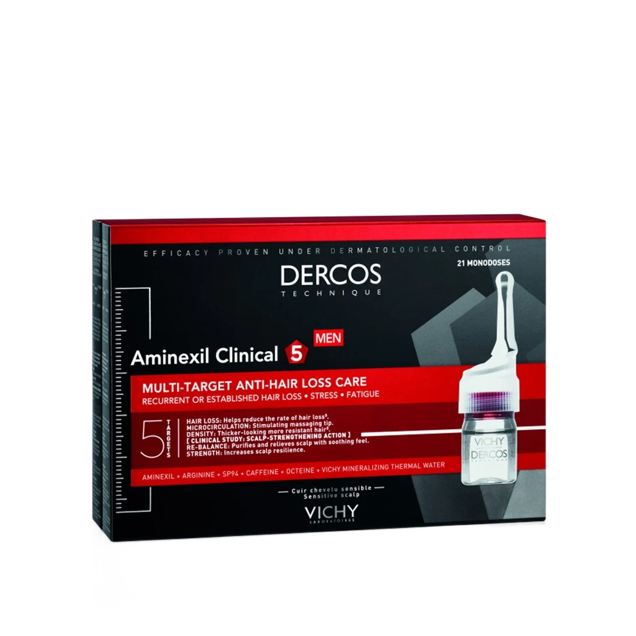 Vichy Dercos Aminexil Clinical 5 Anti-Hair Fall Treatment for Men is designed to effectively combat hair loss. Each pack contains 21 ampoules, each with 6 ml of a potent formula that includes Aminexil and four active ingredients. This treatment strengthens hair anchorage and enhances scalp stimulation for healthier, more resilient hair.